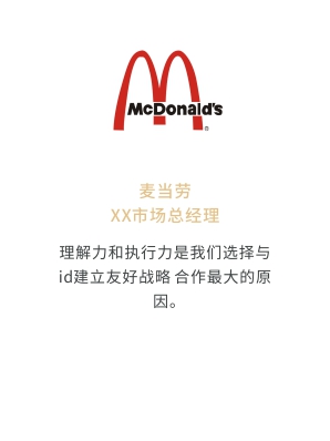 i-d先后經歷與Audi、Mercedes-Benz、infiniti、PORSCHE、可口可樂、麥當勞、肯德基、Budweiser、華為、小米、中國移動、ELLE、L'OREAL、萬達、仁恒置地、恒大、碧桂園、蘭桂坊...的業務合作,成功地將國際化的營銷策劃理念及執(zhí)行方式融入本土,為更多的中國企業開啟全新的品牌推廣思路和執(zhí)行方案。